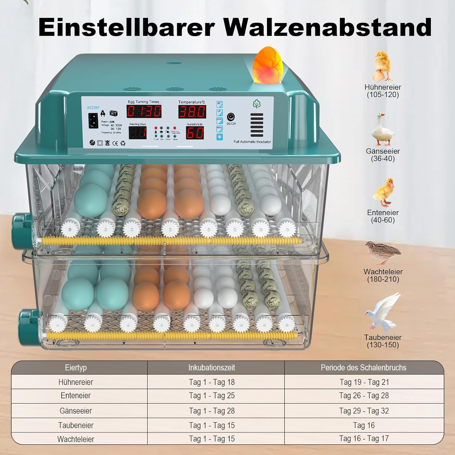 Dual Power Supply: The incubator supports connection to both 220V power supply and a 12V battery (battery not included), providing uninterrupted operation and preventing power failure during incubation.
