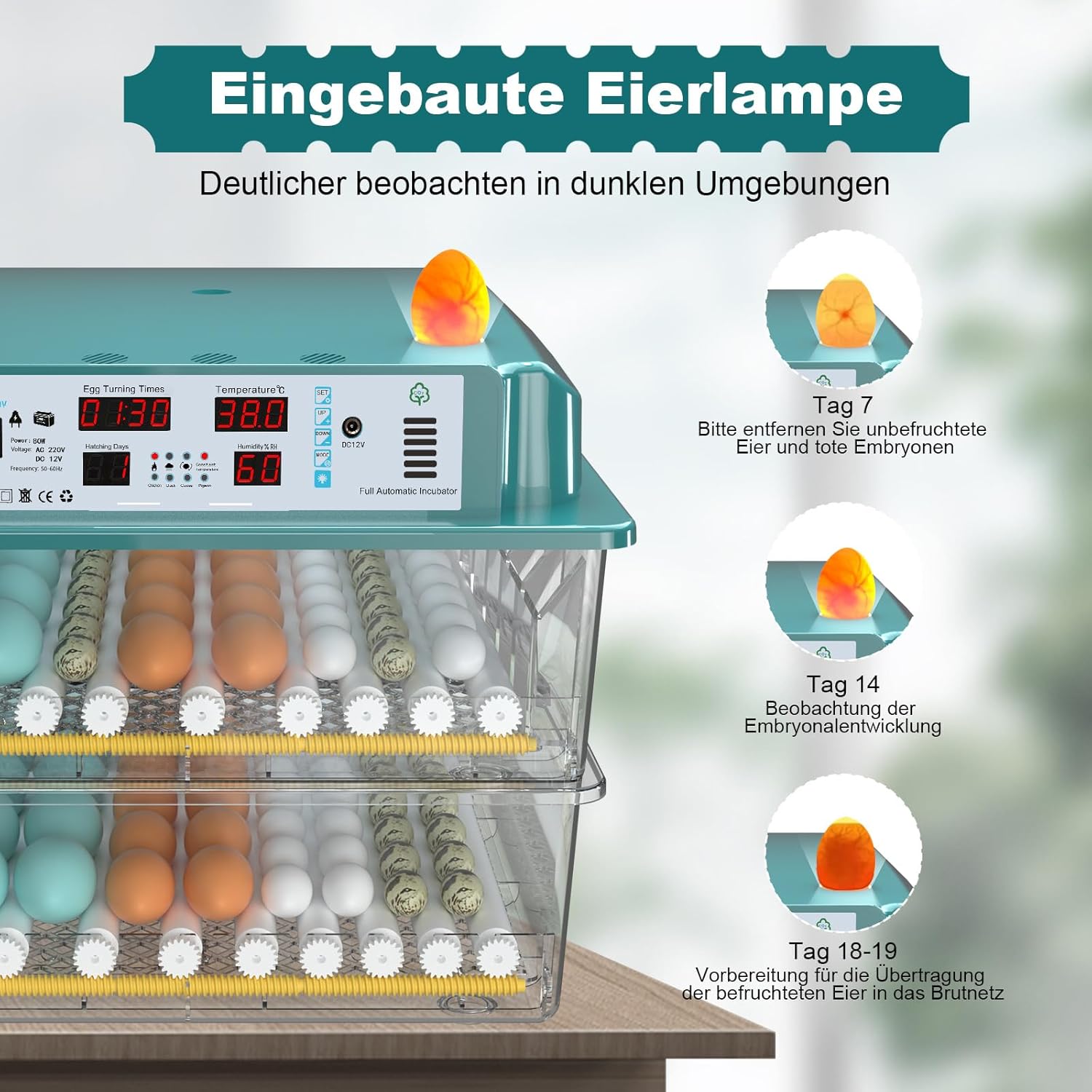 Built-in Egg Lamp: Easily monitor the development of fertilized eggs and identify viable eggs with the integrated egg lamp.