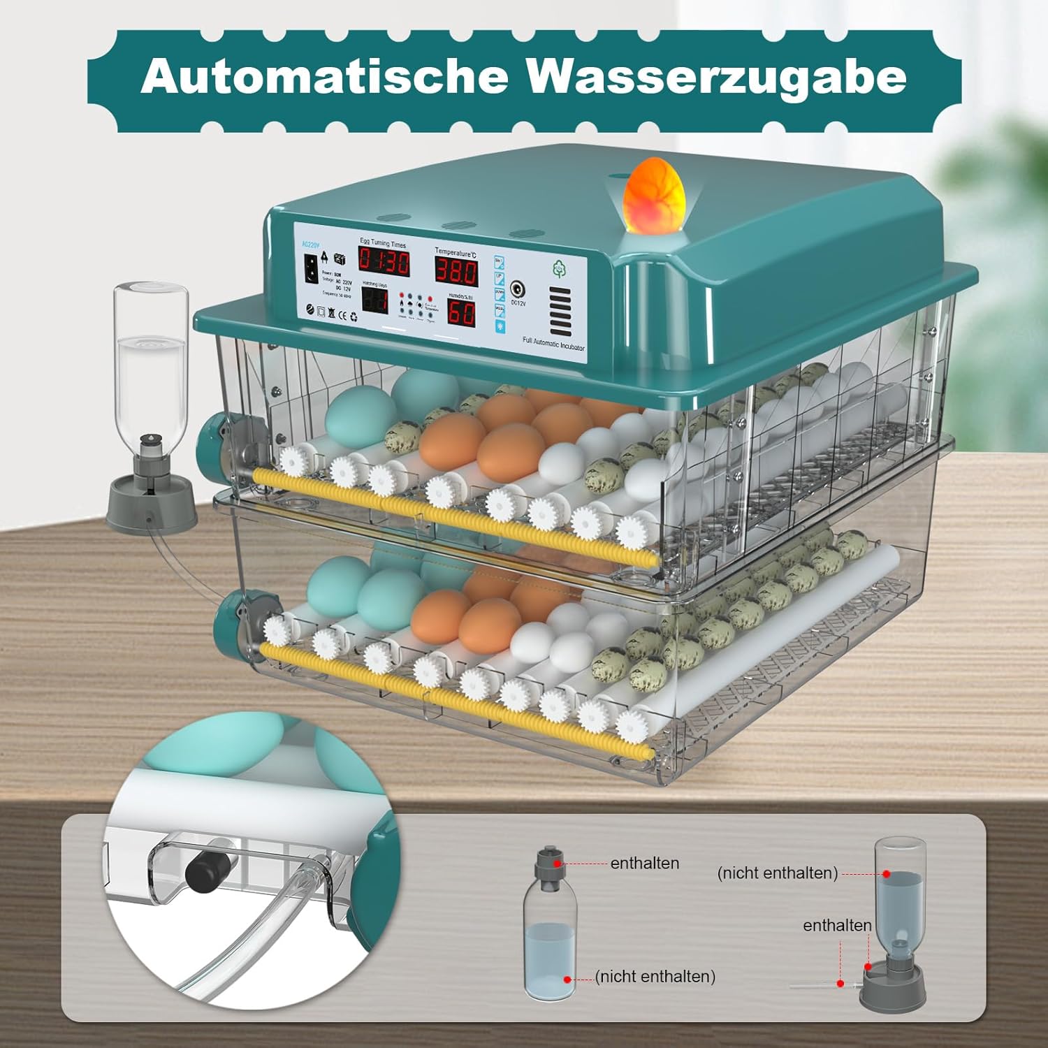 Automatic Humidification: Equipped with an automatic water inlet base, this incubator maintains perfect humidity levels throughout the incubation period without manual intervention.